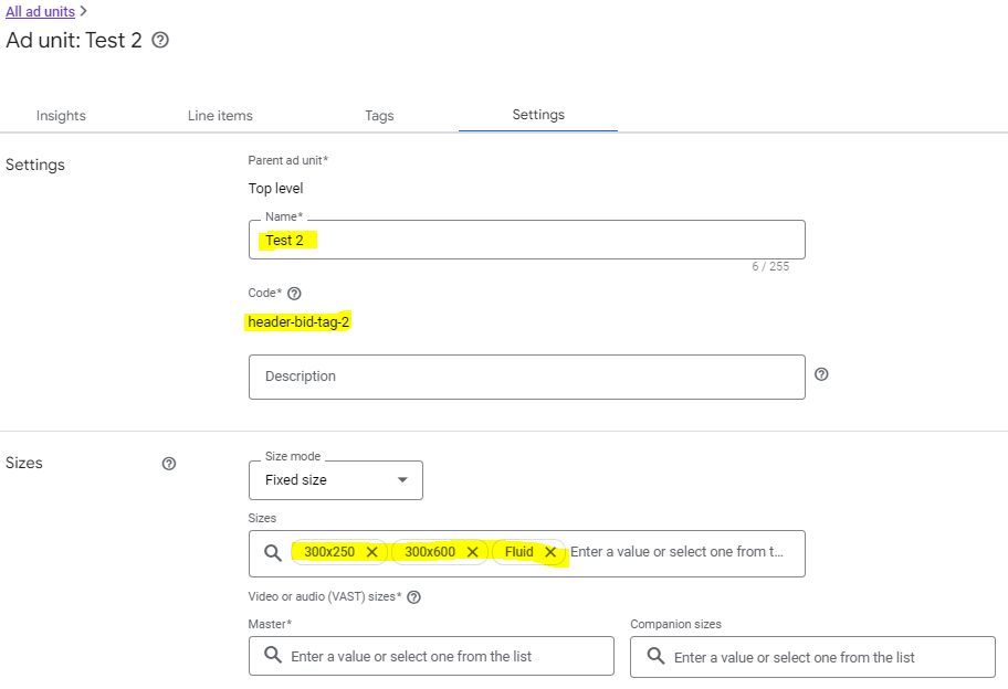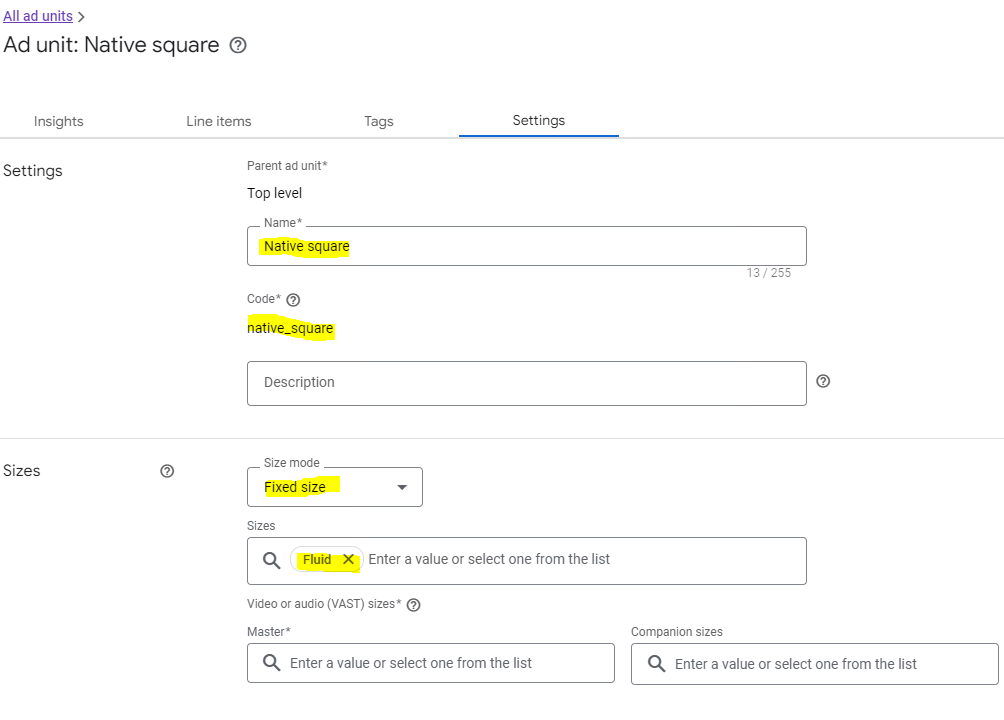 First, you need to define an ad unit. For sizes, you need to select ‘Fluid’ for native ads and possible banner sizes that you want the ad unit to display.