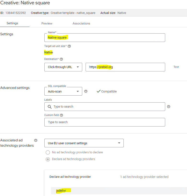 In Creatives of GAM, create a creative named “Native square”. Make sure to choose the previously defined format “native_square” as Creative template. Select “Native” as Target ad unit size. And select “jsdelivr” as ad technology provider.