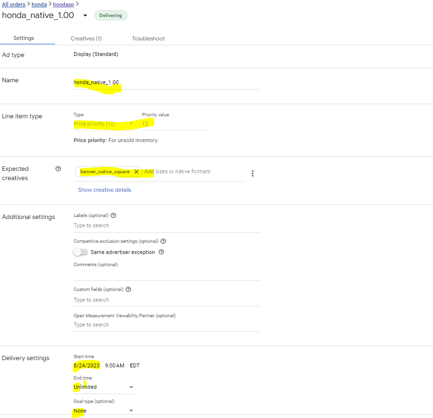 Now, you need to define a second line item for the native ads. Make sure select the previous defined native as Expected creatives (“banner_native_square” for this case).