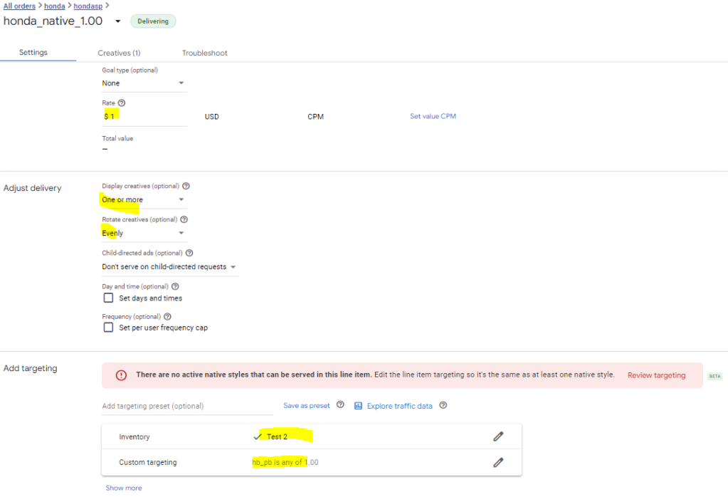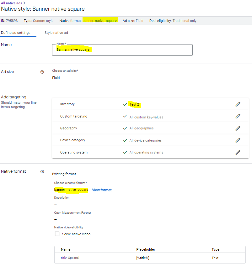 Then, you define a Native. Make sure it targets to the ad unit defined in the previous step (“Test 2” for this case).