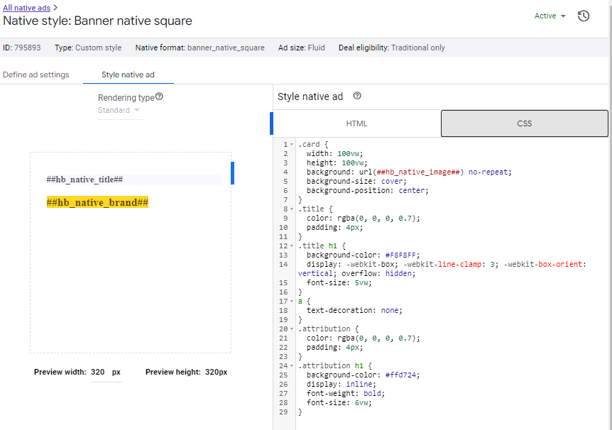 Insert the following code in HTML and CSS of Style native ad tab, respectively.