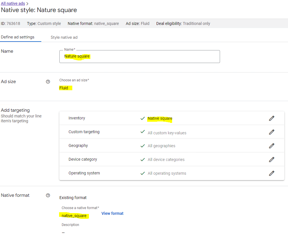 Add a Native style. Make sure choose “Fluid” as an ad size. Select “Native square” ad unit as targeting Inventory. Choose the “native_square” format defined previously.